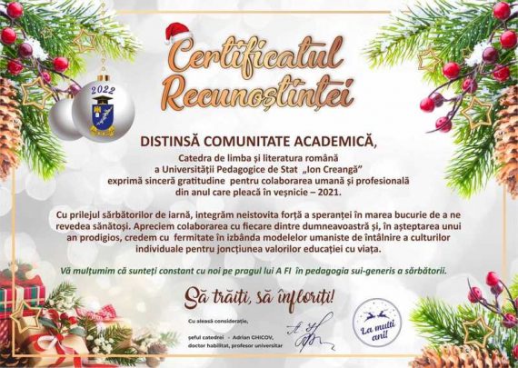 Dragi colegi, stimați prieteni, Sărbătorile de iarnă bat cu râvnă la poarta sufletului nostru, ne copleșesc cu aduceri aminte și ne amplifică speranța. Cu acest prilej, Vă adresăm sincere felicitări și urări de sănătate, bunăstare, belșug și prosperitate. Fie ca spiritul Crăciunului să pătrundă în inimile și casele Dumneavoastră să […]