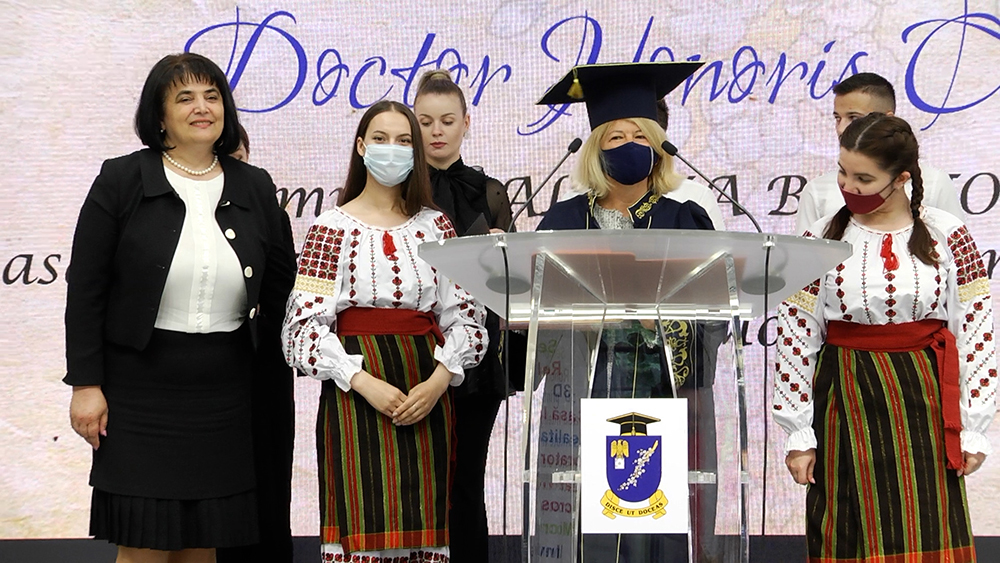 În semn de profundă recunoștință şi apreciere, studenții UPSC au intonat Imnul R. Moldova și al Italiei, Imnul studențesc – Gaudeamus, urmat de cunoscutul „Mulți ani trăiască” și „Tanti Auguri”. Renumitul Laudatio a fost rostit de către Prorectorul pentru activitatea didactică, dr, conf. univ., dna Angela SOLCAN care, făcând o trece în revistă a vieții și activității Excelenței Sale, dnei Valeria BIAGIOTTI, a accentuat faptul că UPSC este onorată de fidelitatea relațiilor amicale moldo-italiene și de prestanța academică a dnei Valeria BIAGIOTTI printre care se enumeră și donațiile de carte în limba italiană pentru Centrul de Limbă şi Cultură Italiană din cadrul Facultăţii de Limbi şi Literaturi Străine a UPSC.