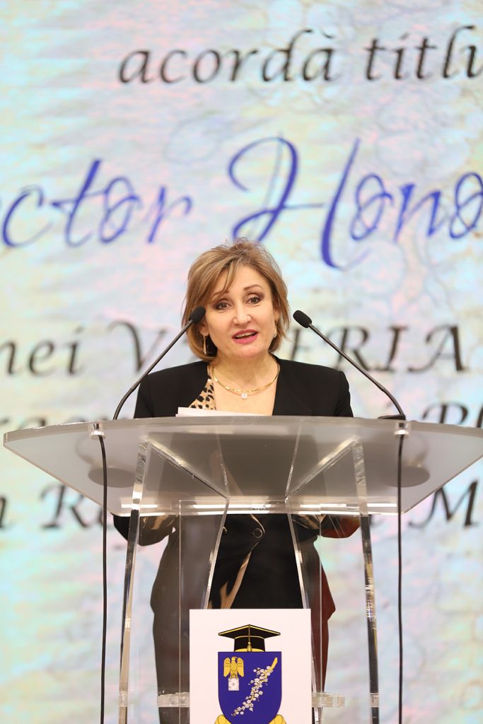 Excelența Sa, dna Valeria BIAGOTTI, în alocuțiune a rostit Oratio Gratitudinis și a prezentat sincere mulțumiri pentru înaltul titlu onorific acordat, specificând că parteneriatul politic, cultural dar și academic cu R. Moldova a fost o plăcere care a adus beneficii bilaterale.