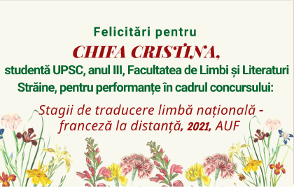 Încă un prilej de mare bucurie și mândrie pentru UPS „Ion Creangă” din Chișinău, aici cresc performanțele! Administrația UPS „Ion Creangă” exprimă sincere felicitări studentei CHIFA Cristina, anul III de studii, Facultatea de Limbi și literature străine, pentru performanța obținută în concursul de Stagii de traducere: limbă națională – franceză […]