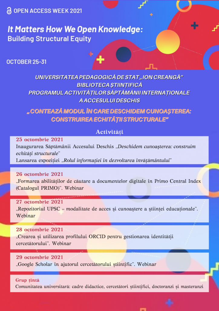 Săptămâna Internaţională a Accesului Deschis la informație 2021 (Open Access Week) este un eveniment global, care a ajuns în acest an la a 14-a ediţie. Tema declarată pentru anul 2021 este „Contează modul în care deschidem cunoașterea: construirea echității structurale” (“It Matters How We Open Knowledge: Building Structural Equity”).