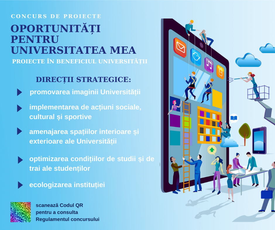 Regulamentul privind desfășurarea concursului de proiecte în beneficiul Universității „Oportunități pentru Universitatea mea” aici sau, poate fi accesat prin scanarea Codului QR din imagine.