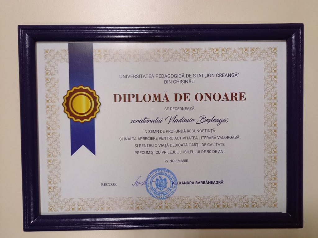 Universitatea Pedagogică de Stat ,,Ion Creangă” din Chișinău a apreciat anterior personalitatea lui Vladimir Beșleagă cu titlul onorific DOCTOR HONORIS CAUSA, cu MEDALIA ,,Ion Creangă”. Iar în cadrul Evenimentul despre care vorbim, Rectorul UPSC, dna conf. univ, dr. Alexandra BARBĂNEAGRĂ a decernat scriitorului Vladimir BEȘLEAGĂ DIPLOMA DE ONOARE!
