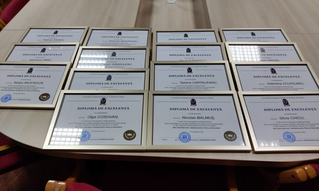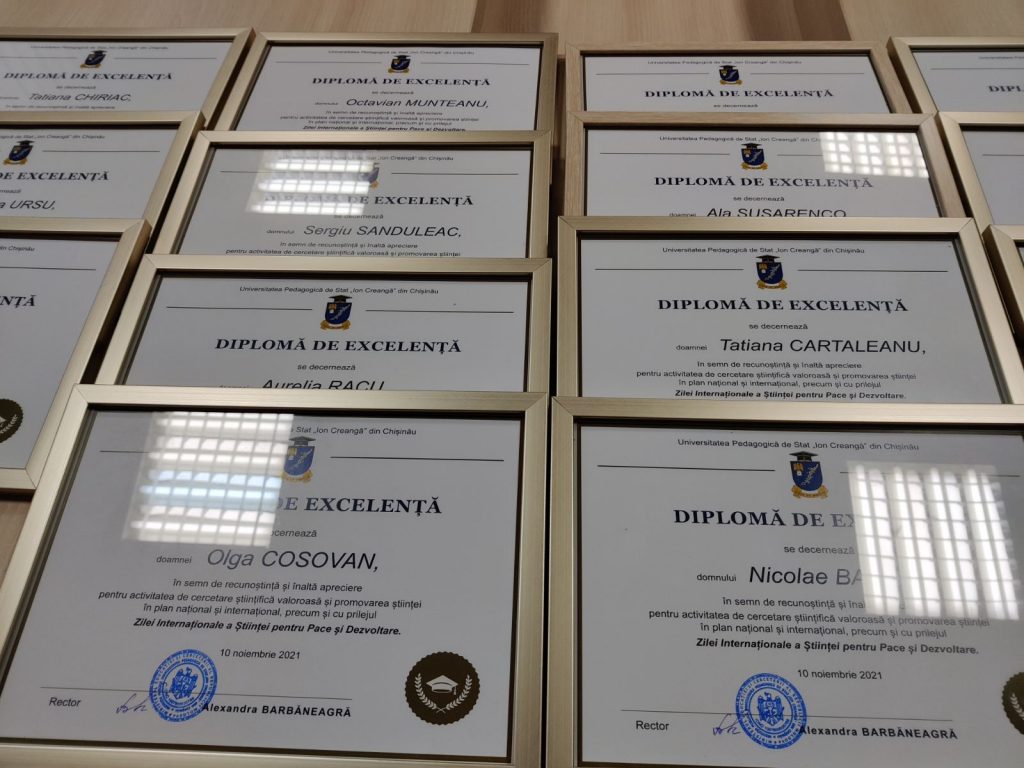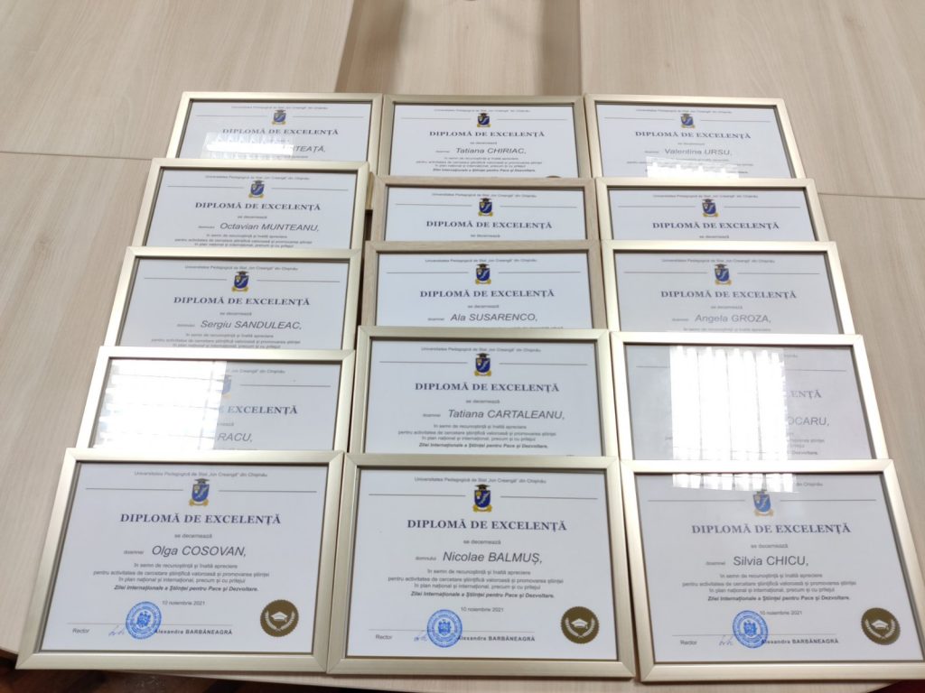 Astăzi, 29 noiembrie 2021, în cadrul Ședinței Senatului UPSC, desfășurată în format mixt, în semn de recunoștință și înaltă apreciere pentru activitatea de cercetare științifică valoroasă și promovarea științei în plan național și internațional, precum și cu prilejul Zilei Internaționale a Științei pentru Pace și Dezvoltare, 15 nume notorii ale cercetării științifice s-au bucurat de conferirea Diplomelor de Excelență.