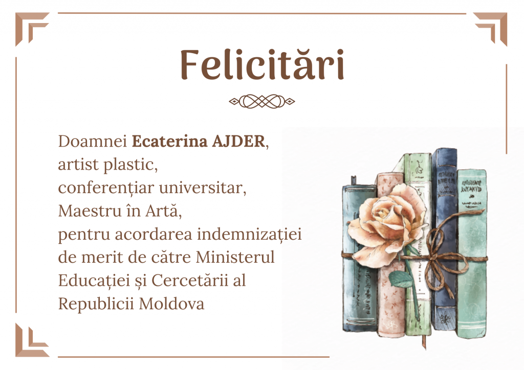 În semn de înaltă apreciere și recunoaștere a eforturilor depuse în cercetările pe domeniul artelor plastice, Ministerul Educației și Cercetării al Republicii Moldova a acordat indemnizația de merit Doamnei Ecaterina AJDER, artist plastic, conferențiar universitar, Maestru în Artă.