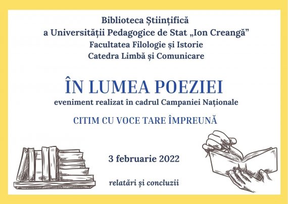 Astăzi, 3 februarie 2022, Biblioteca Științifică a Universității Pedagogice de Stat „Ion Creangă” din Chișinău, în parteneriat cu Facultatea Filologie și Istorie, Catedra Limbă și Comunicare, a desfășurat online evenimentul literar-artistic „În lumea poeziei”, în cadrul căruia au fost citite cu voce tare, în limbile română, rusă, engleză și bulgară, […]