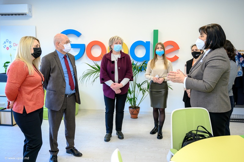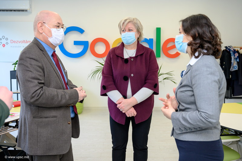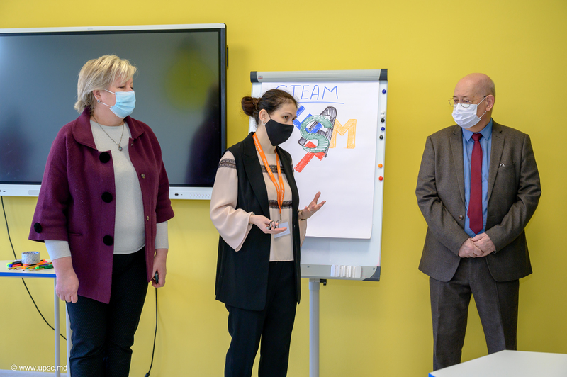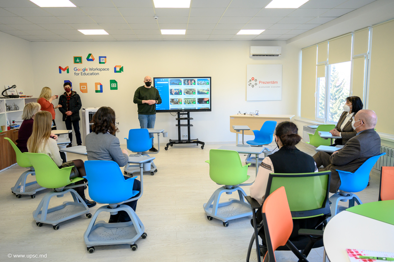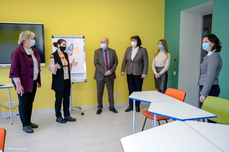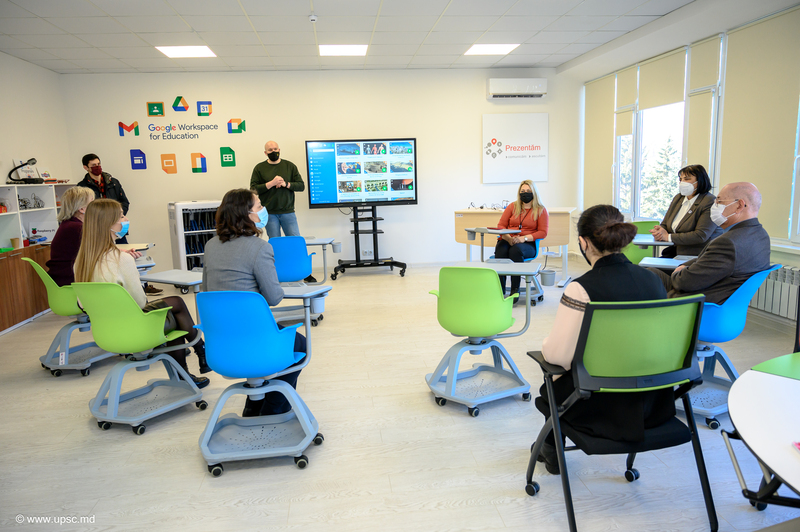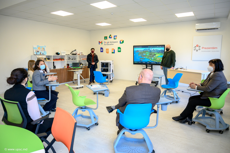 Vicedirectoarea CNIDE „Clasa Viitorului”, UPSC, Carolina BONDARCIUC, trainer instruiri, Alexandru LEAHU, coordonator instruiri și Alexandru OBADĂ au prezentat oaspeților Centrul Național de Inovații Digitale în Educație și noile echipamente digitale educaționale.