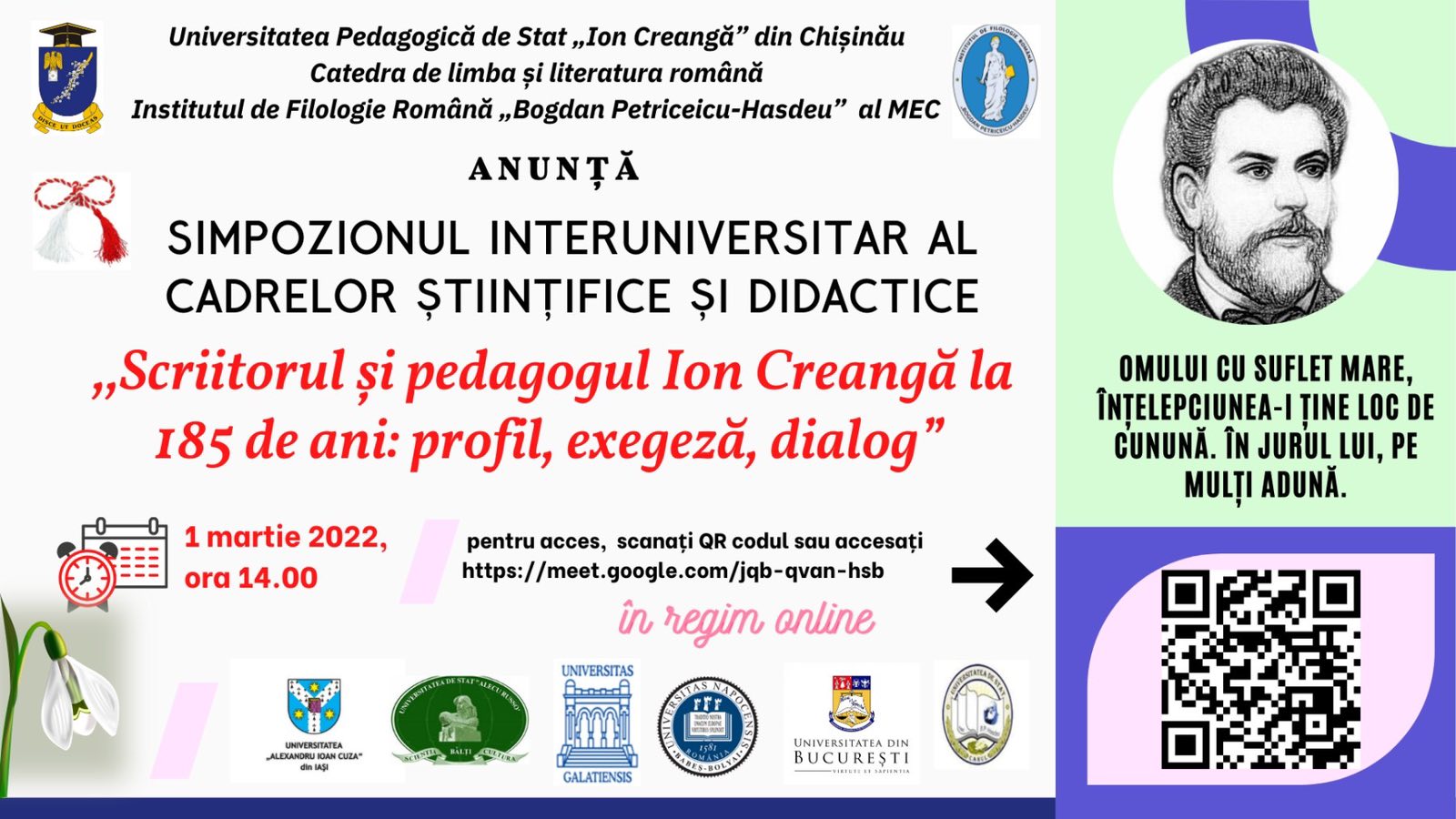 Catedra de limba și literatura română a Facultății de Filologie și Istorie a UPSC în parteneriat cu Institutul de Filologie Română ,,Bogdan Petriceicu-Hasdeu” al AȘM organizează marți, 1 Martie 2022, Simpozionul interuniversitar al cadrelor științifice și didactice ,,Ion Creangă la 185 de ani: profil, exegeză, dialog”.
