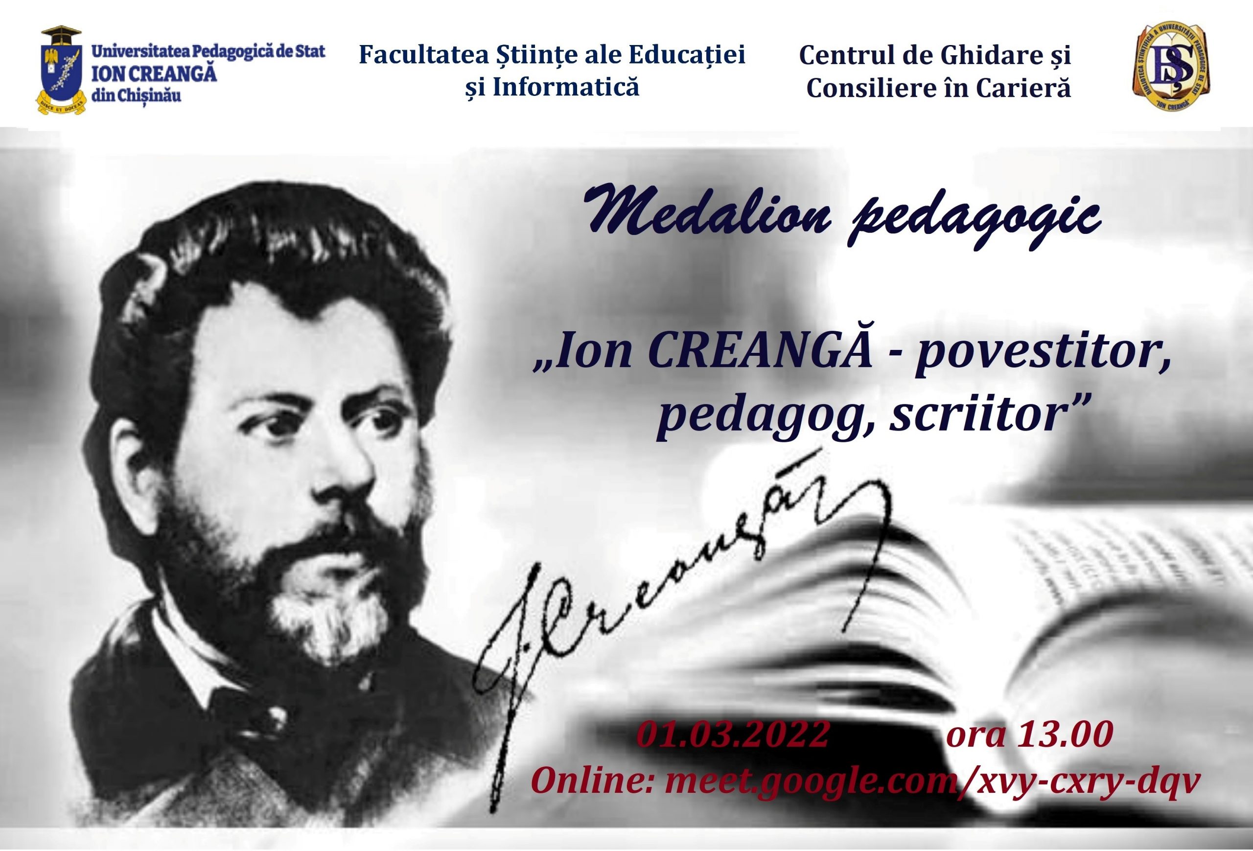 Facultatea Științe ale Educației și Informatică în parteneriat cu Biblioteca Științifică și Centrul de Ghidare și Consiliere în Carieră, UPSC, cu prilejul marcării a 185 de ani de la nașterea lui Ion Creangă, organizează Medalionul pedagogic cu genericul „Ion CREANGĂ – povestitor, pedagog, scriitor”.