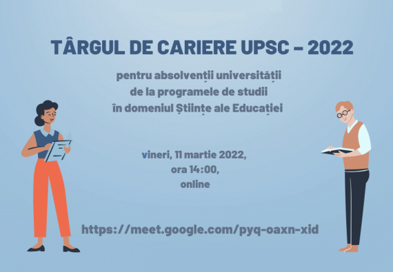 Centrul de Consiliere și Ghidare în Carieră a UPSC organizează vineri, 11 martie 2022, ora 14:00, în format online: TÂRGUL DE CARIERE UPSC – 2022. Activitatea este destinată absolvenților UPSC ai programelor de studii din domeniul Științe ale Educației, care se vor înregistra accesând formularul aici: https://forms.gle/fovbfUcREZ8SWggy7 Vor fi prezenți: […]