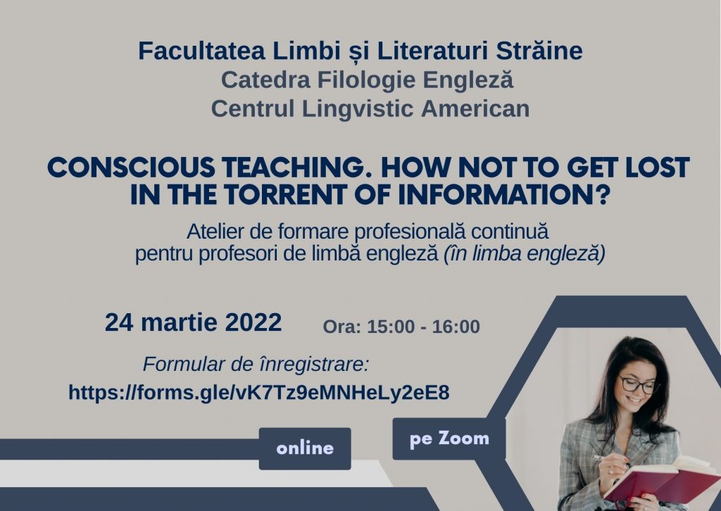 Catedra Filologie Engleză din cadrul Facultății Limbi și Literaturi Străine, UPSC anunță desfășurarea atelierului de formare profesională continuă pentru profesori de limbă engleză (în limba engleză) dedicat predării conștiente. Cum să nu te pierzi în torentul de informații? – „Conscious Teaching. How not to get lost in the torrent of information?”.