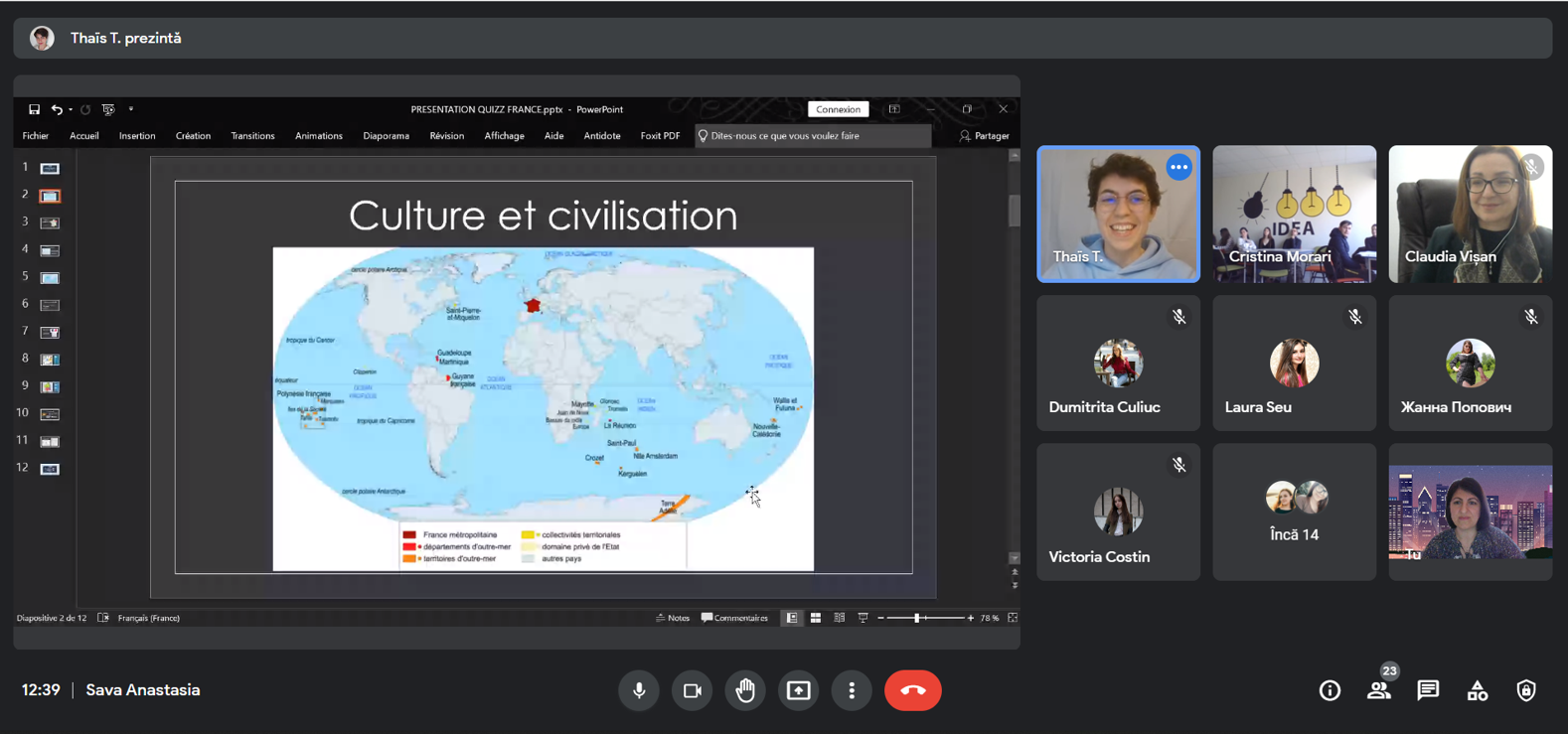 Dans le contexte de la célébration des Journées de la Francophonie, le 23 mars 2022 le Département de Philologie Romane en partenariat avec le Lectorat français de Moldavie représenté par la lectrice-stagiaire Mme Thaïs Thiburs ont organisé le concours en ligne sur Kahoot „Le grand quizz sur la culture et la civilisation françaises” destiné à tous les étudiants francophones, ayant comme objectifs: