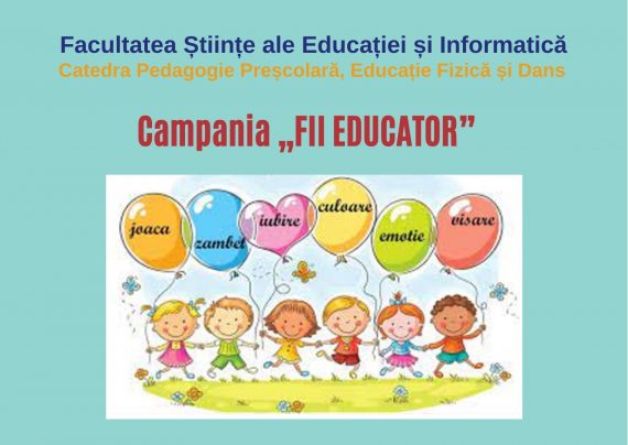 În data de 20 aprilie 2022, catedra Pedagogie Preșcolară, Educație Fizică și Dans din cadrul Facultății Științe ale Educației și Informatică, a lansat Campania „FII EDUCATOR!” Scopul campaniei constă în promovarea profesiei de educator și motivarea tinerilor de a îmbrățișa această nobilă profesie. În debutul evenimentului, Șefa catedrei Pedagogie Preșcolară, […]
