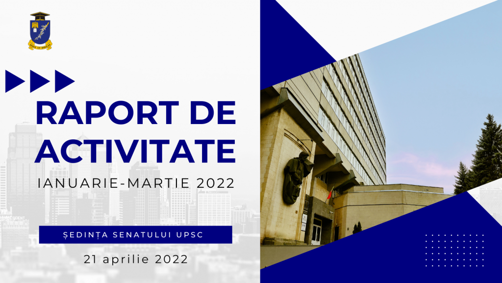 În ședința Senatului UPSC de astăzi, 21 aprilie 2022, conf. univ., dr. Alexandra BARBĂNEAGRĂ, Rectorul UPSC, a prezentat raportul privind activitatea subdiviziunilor administrative universitare în perioada ianuarie-martie 2022.