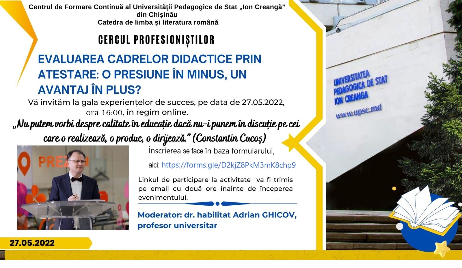 Catedra de limba și literatura română și Centrul de Formare, UPSC organizează CERCUL PROFESIONIȘTILOR cu tema EVALUAREA CADRELOR DIDACTICE PRIN ATESTARE: O PRESIUNE ÎN MINUS, UN AVANTAJ ÎN PLUS?