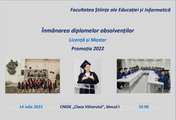 Facultatea Științe ale Educației și Informatică anunță înmânarea Diplomelor de Licență și a celor de Master pentru absolvenții promoției 2022. Stimate cadre didactice, dragi absolvenți ai programelor de studii Ciclul I, Licență (învățământ cu frecvență și cu frecvență redusă) și Ciclul II, Master, vă invităm la festivitatea de înmânare a […]