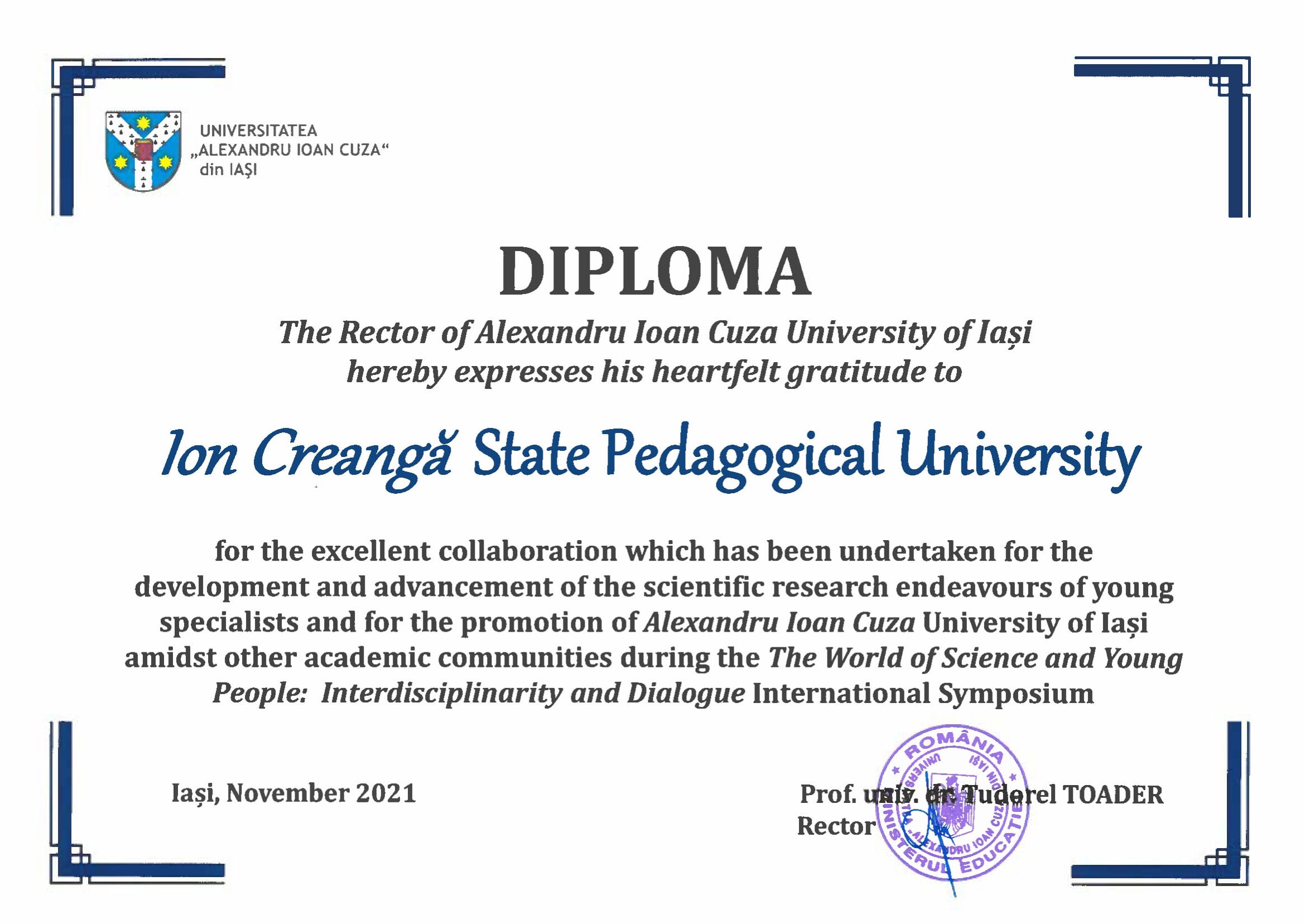 Între Universitatea Pedagogică de Stat „Ion Creangă” din Chișinău și Universitatea „Al. Ioan Cuza” din Iași s-a stabilit o colaborare frumoasă. În ultimii ani, Catedra de limbă și comunicare a Facultății de Filologie și Istorie, în colaborare cu catedra de Slavistică de la Universitatea din Iași, în parteneriat cu Universitatea Națională Euroasiatică „Lev Gumiliov” din Nur-Sultan (Kazahstan), Universitatea de Stat din Cerepoveț și din Smolensk (Rusia) organizează tradițional Conferința internațională „Lumea științei și tinerii: Interdisciplinaritate și dialog”, la care participă studenții și masteranzii. De la ediție la ediție geografia implicării participanților se extinde îmbucurător. Astfel, la cea de-a X-a ediție, care s-a desfășurat online, pe 4 noiembrie 2021, au participat 50 de studenți și masteranzi din 14 centre universitare din România, Polonia, Moldova, Kazahstan, Azerbaidjan, Ucraina, Belarus, Rusia.