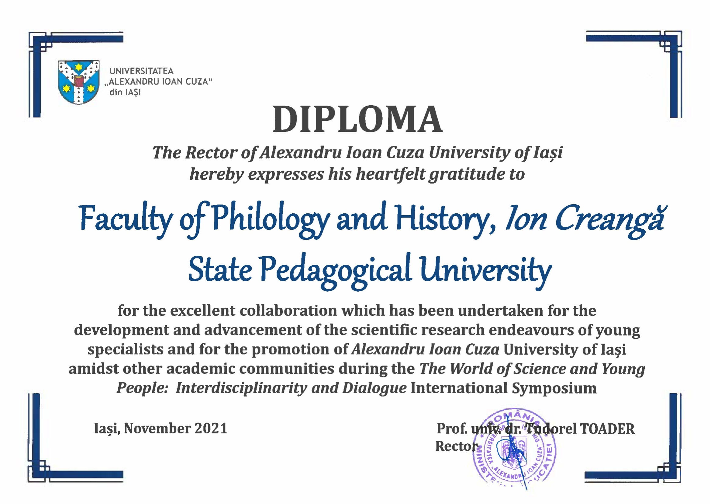 La finele anului au fost făcute totalurile activității Universității „Al. I. Cuza” pentru anul de studii 2021/2022 și Universitatea noastră și Facultatea de Filologie și Istorie au obținut onorabila diplomă a Rectorului Tudorel Toader pentru colaborarea excelentă întreprinsă pentru dezvoltarea și promovarea eforturilor de cercetarea științifică a tinerilor și pentru promovarea Universității Alexandru Ioan Cuza din Iași în rândul altor comunități academice.