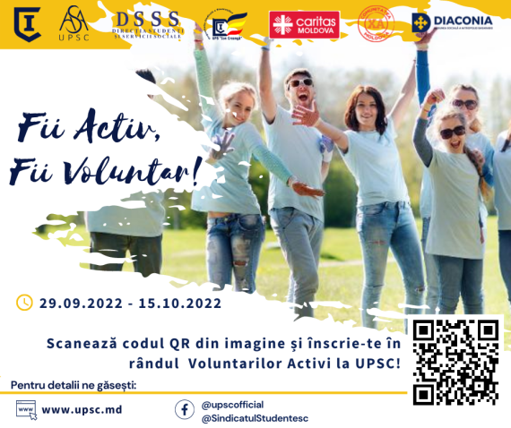 Asociația Studenților și Absolvenților Universității Pedagogice de Stat „Ion Creangă” din Chișinău, la data de 29 septembrie 2022, lansează campania de înregistrare în rândul voluntarilor activi pentru studenții UPSC. La intrarea în blocurile de studii ale UPSC, joi, 29 septembrie 2022, în intervalul 9:30 – 11:30, vor fi distribuite flyere […]