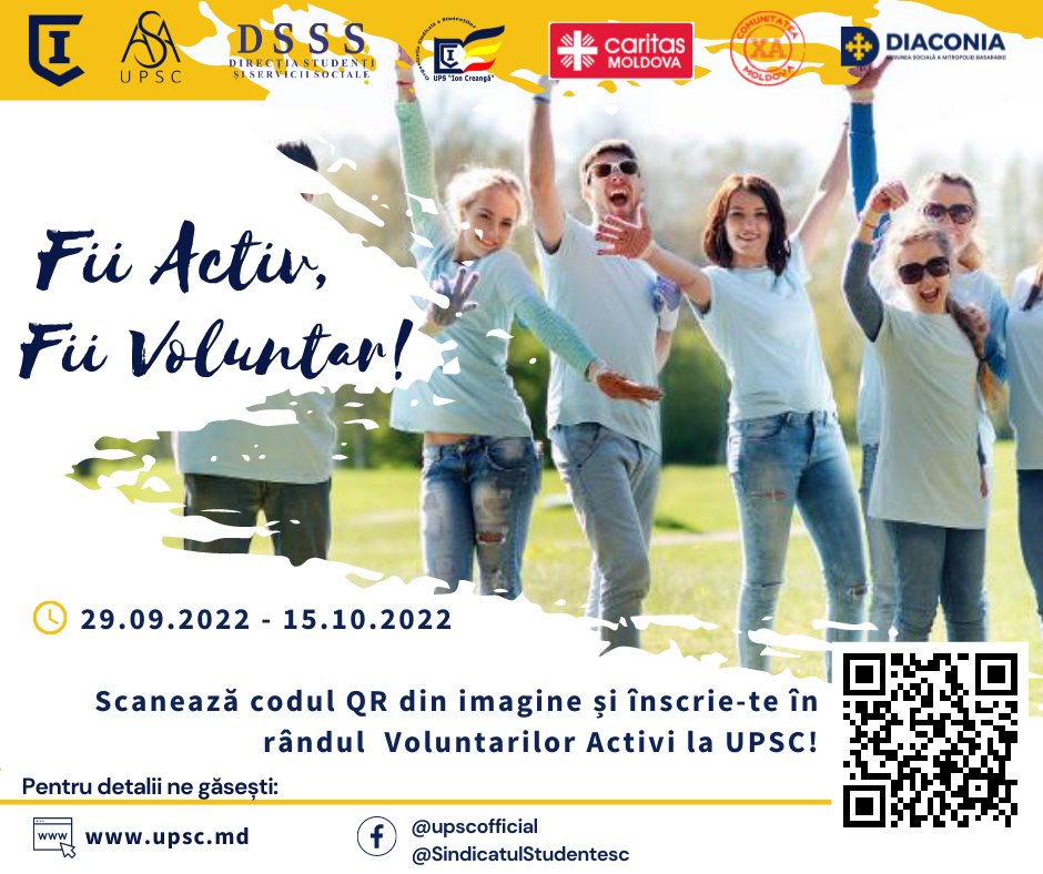 La intrarea în blocurile de studii ale UPSC, joi, 29 septembrie 2022, în intervalul 9:30 – 11:30, vor fi distribuite flyere informative despre posibilitatea înscrierii în rândul voluntarilor activi ai UPSC. Este suficient să scanezi codul QR și să completezi formularul, astfel, vei putea să ne informezi despre domeniile tale de interes și noi te vom ajuta să te implici în activități de voluntariat.