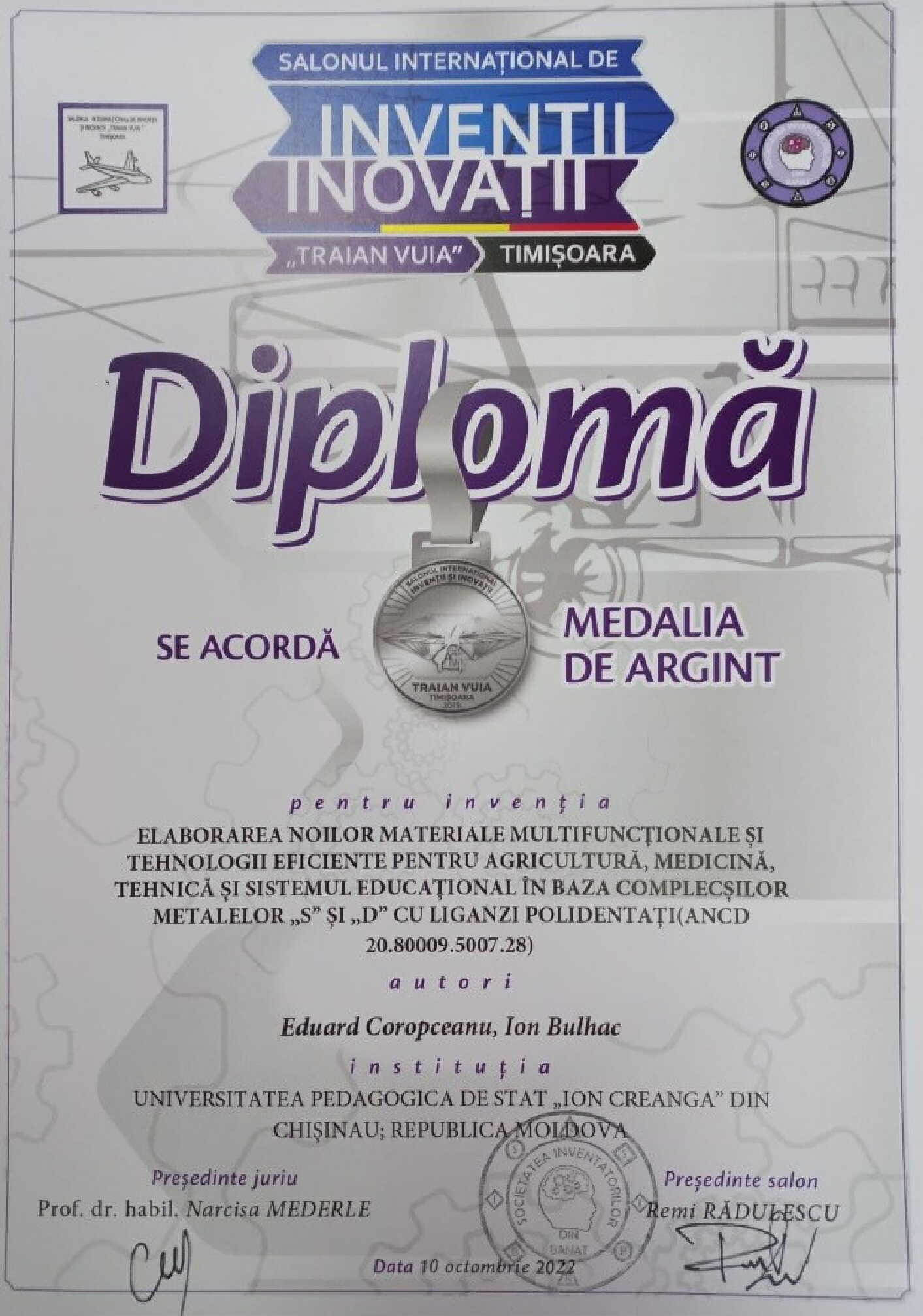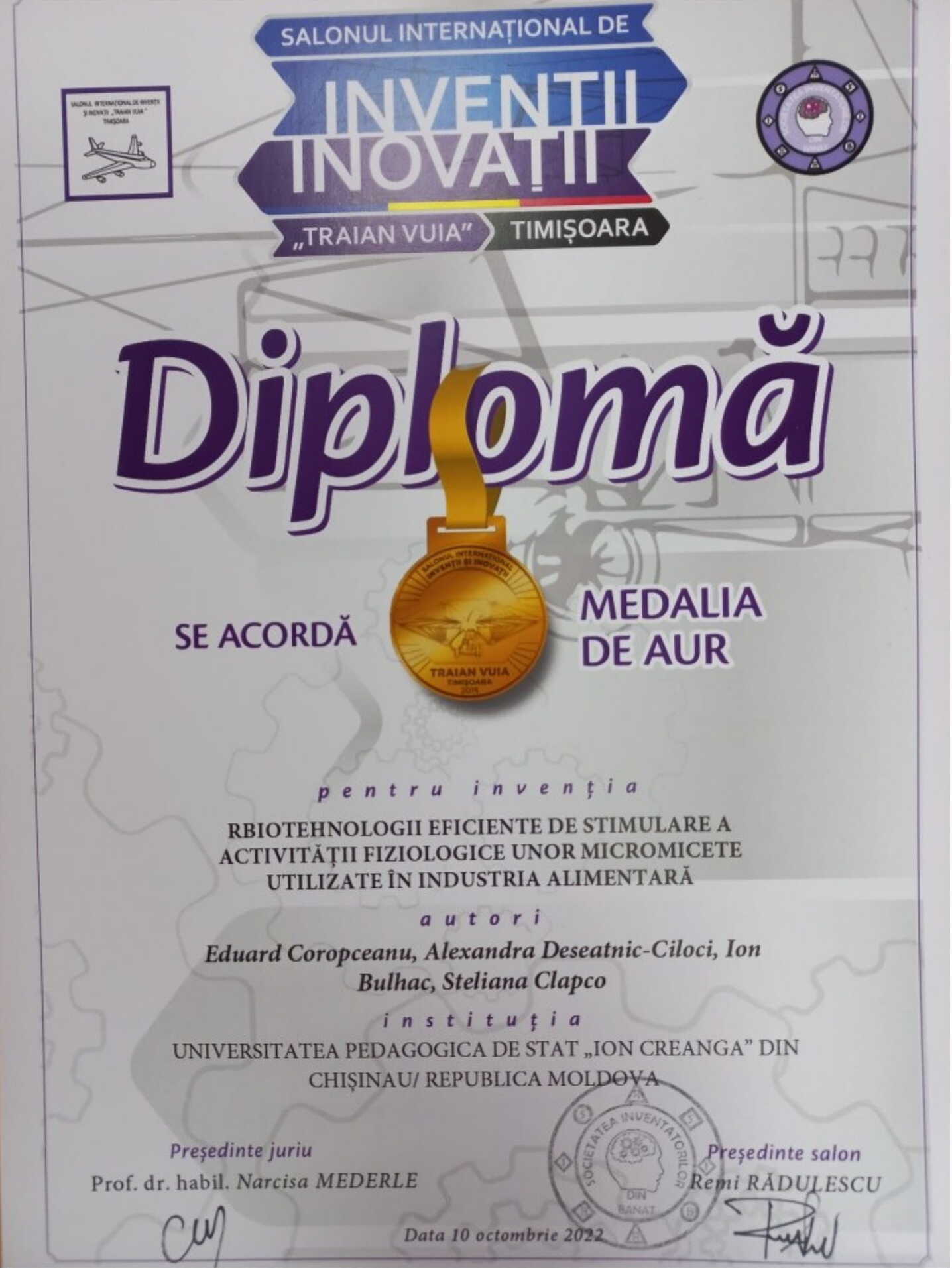 Așadar, în cadrul Salonului Internațional de Invenții și Inovații „Traian Vuia” (Timișoara, România, 8 – 10 octombrie 2022) Universitatea Pedagogică de Stat „Ion Creangă” a obținut 2 medalii de aur și una de argint: