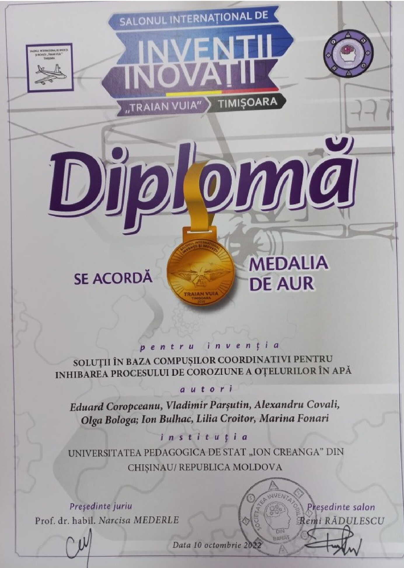 Eduard COROPCEANU, Vladimir PARŞUTIN, Alexandru COVALI, Olga BOLOGA, Ion BULHAC, Lilia CROITOR, Marina FONARI, „Soluții în baza compușilor coordinativi pentru inhibarea procesului de coroziune a oțelurilor în apă”.