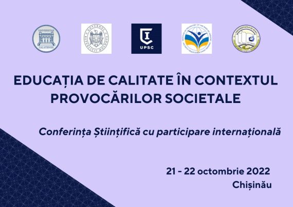 Vineri, 21 octombrie 2022, Universitatea Pedagogică de Stat „Ion Creangă” din Chișinău va fi gazda Conferinței Științifice cu Participare Internațională cu genericul „EDUCAȚIA DE CALITATE ÎN CONTEXTUL PROVOCĂRILOR SOCIETALE”. Conferința este organizată şi desfăşurată cu prezență fizică și online în contextul parteneriatelor: Ministerul Educaţiei şi Cercetării al Republicii Moldova, Universitatea […]