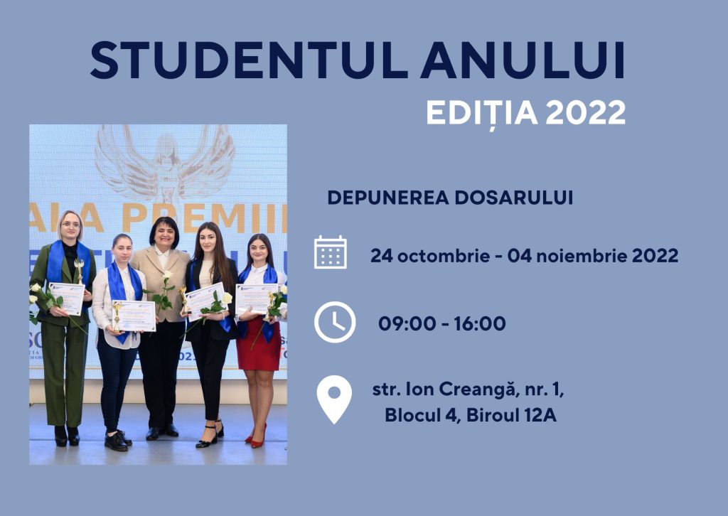 Festivitatea de premiere a învingătorilor este organizată public la GALA PREMIILOR – STUDENTUL ANULUI 2022, care va avea loc pe data de 22 noiembrie 2022, ora 13:00, Clasa Viitorului, str. Ion Creangă, nr. 1, Blocul I de studii.