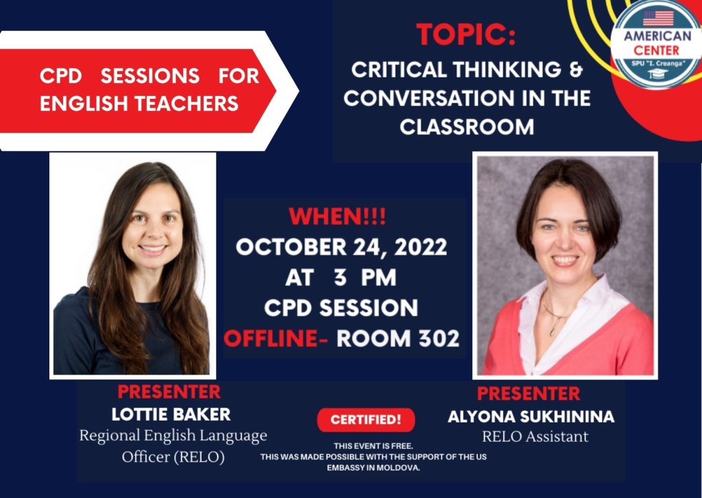 Centrul American din cadrul UPSC invită profesorii de limbă engleză la un workshop de formare profesională cu tema „Critical Thinking & Conversation in the Classroom” susținut de către Lottie Baker, Regional English Language Officer (RELO) și Alyona Sukhinina, RELO Assistant. Formarea va avea loc la 24 octombrie 2022, ora 15:00.