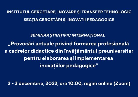 Scopul evenimentului științific: identificarea strategiilor funcționale de stimulare a elaborării șiimplementării inovațiilor în învățământul preuniversitar. Evenimentul științific este înscris în Registrul Național al Manifestărilor Științifice, 2022Participanți: cadre științifico-didactice universitare, cercetători științifici, profesori școlari, doctoranzi,masteranzi.Participanții vor obține Certificat de participare.Organizator: BOROZAN Maia, profesor universitar, dr. hab.Date de contact: ccip.ust.2020@gmail.comLinkul Formularului de […]