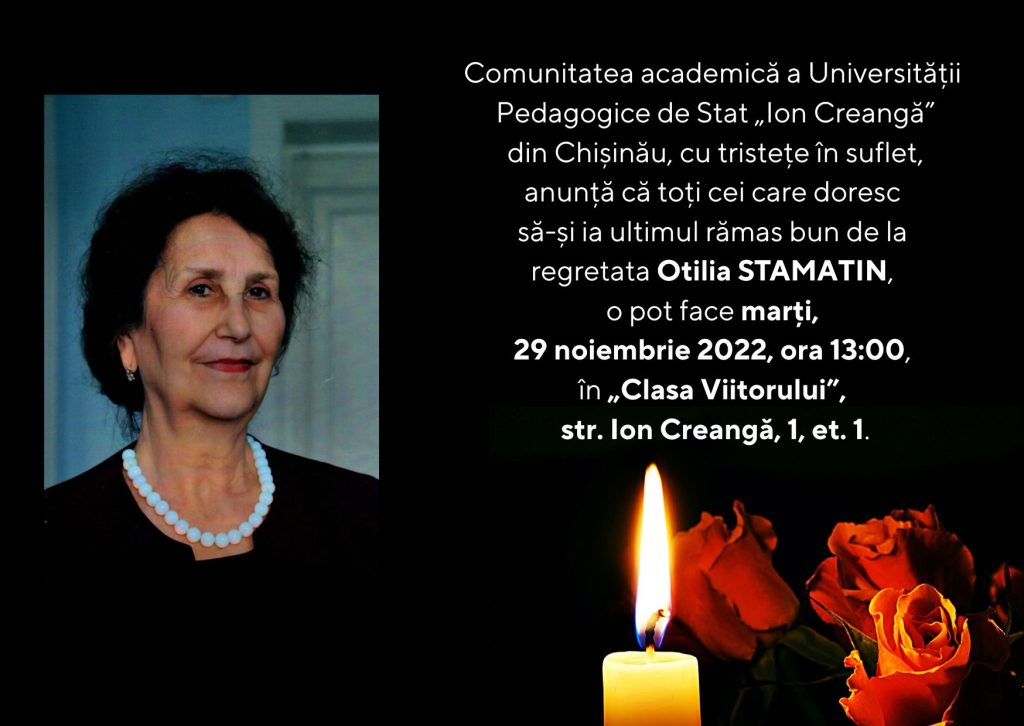 Comunitatea academică a Universității Pedagogice de Stat „Ion Creangă” din Chișinău, cu tristețe în suflet, anunță că, toți cei, care doresc să-și ia ultimul rămas bun de la regretata Otilia STAMATIN, o pot face marți, 29 noiembrie 2022, ora 13:00, în „Clasa Viitorului”, str. Ion Creangă, 1, et. 1.