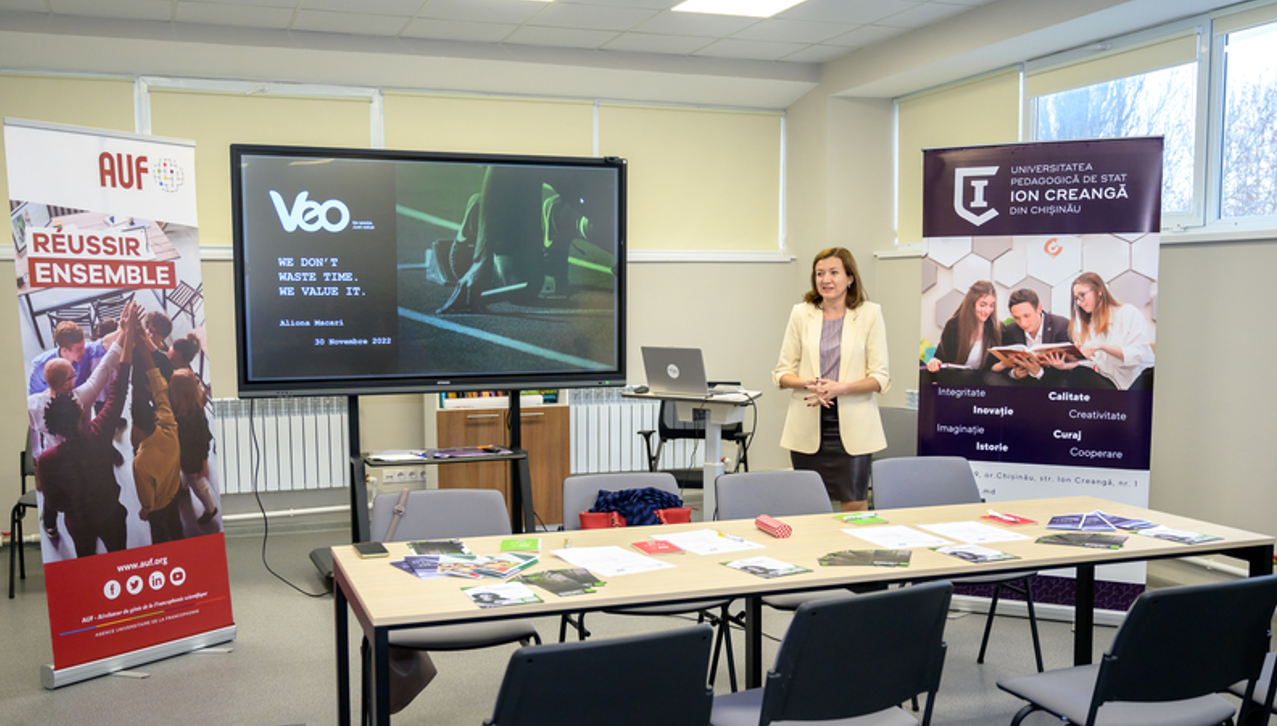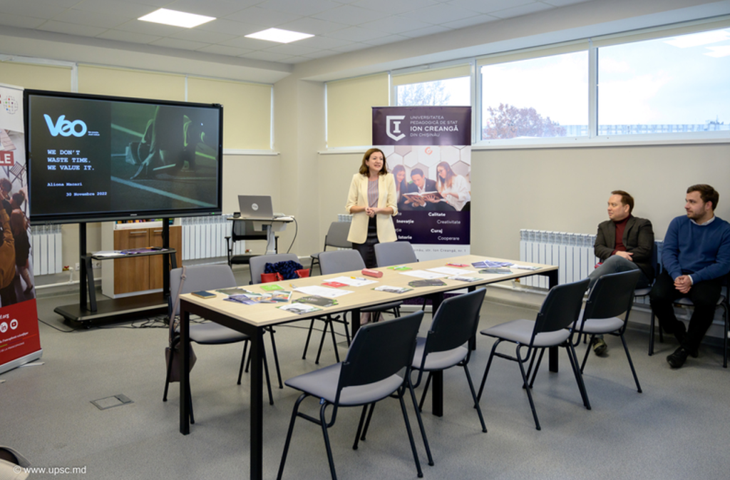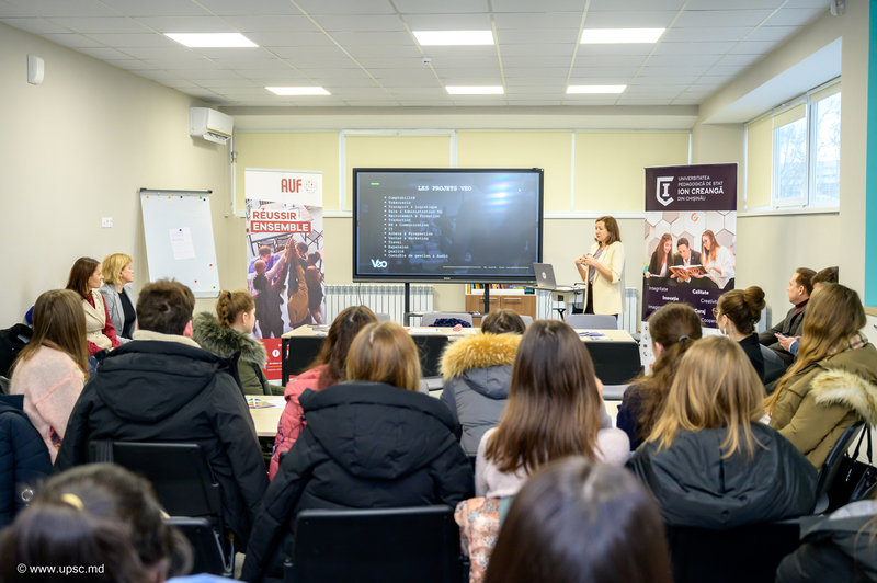 Doamna Natalia CELPAN-PATIC, reponsabila CEF, care va fi inaugurat în curând la UPSC cu sprijinul AUF, a explicat misiunea acestuia studenților Facultății de Limbi și Literaturi Străine și ai Facultății de Științe ale Educației: susținerea studenților în integrarea lor profesională. Întreprinderea invitată, de data aceasta, a fost VEO Worldwide Services – furnizor de servicii B2B, cu sediul în Europa, cu 16 ani de activitate și care caută în permanență soluții ca să ajute proprietarii de afaceri să își valorifice stocurile nevândute (colecții anterioare, produse cu termene de valabilitate scurte, comenzi anulate etc.) și să devină eficiente.