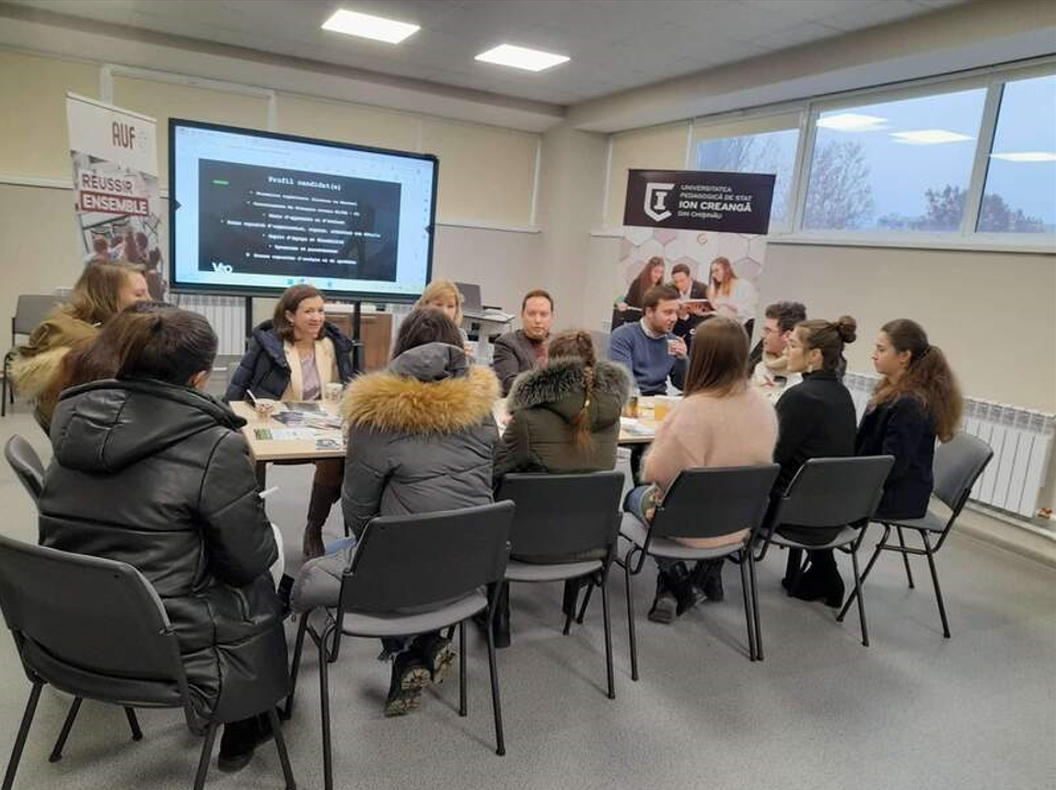 La data de 30.11.2022, Secția Relații Internaționale și Managementul Proiectelor a invitat studenții francofoni ai Universității Pedagogice de Stat „Ion Creangă” din Chișinău la o întâlnire cu companii franceze, în cadrul Proiectului CEF susținut de Agenția Universitară a Francofoniei. A fost prima ediție a acestui eveniment, care se înscrie în axa 1 a ofertei de servicii CEF: consiliere, informare și tutorat de angajare.