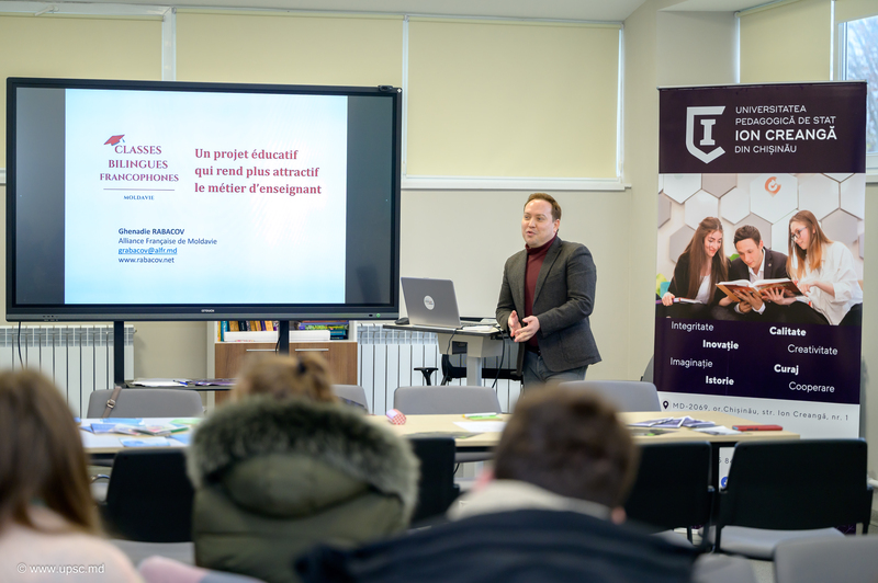 Printre invitați a fost și domnul Ghenadie RÎBACOV, Coordonatorul Claselor bilingve francofone, care a prezentat oportunitățile viitorilor profesori de FLS în cazul în care vor alege licee bilingve pentru a se angaja. Domnul Simon RIGO, responsabil de misiune lingvistică la Alianța Franceză din Moldova, a vorbit despre oportunitățile de continuare a studiilor în Franța pentru studenții noștri, pentru a se integra fără dificultate pe piața locală a muncii.