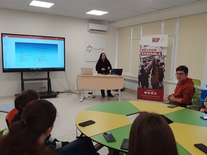 Formatoarea Natalia Mucerschi, profesor la Universitatea de Stat din Moldova, traducător și interpret, a condus perfect „Atelierul de traducere și interpretare specializată pentru viitorii studenți FLS”, dezvăluind câteva secrete profesionale și dând posibilitate studenților de a practica traducerea și interpretarea. La rândul lor, elevii au adresat întrebări pentru a descoperi mai bine această activitate complementară carierei lor. Formarea dată se înscrie în axa 1 a ofertei de servicii CEF: consiliere, informare și tutorat de angajare. Reamintim că proiectul CEF UPSC a fost înființat datorită sprijinului Agenției Universitare a Francofoniei.