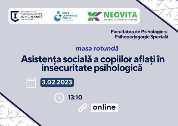 În data de 3 februarie 2023, ora 13:10, se va desfășura, în format online, masa rotundă „Asistența socială a copiilor aflați în insecuritate psihologică”, având ca scop formarea atitudinii, abilităților și cunoștințelor privind securitatea psihologică a copiilor. Evenimentul este organizat de către Catedra de asistență socială a Facultății de Psihologie și Psihopedagogie Specială, UPSC, în colaborare cu […]