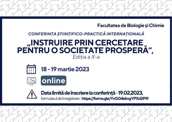 Universitatea Pedagogică de Stat „Ion Creangă” din Chișinău FACULTATEA DE BIOLOGIE ŞI CHIMIE organizează CONFERINŢA ŞTIINŢIFICO-PRACTICĂ INTERNAȚIONALĂ ,,EDUCAȚIE PRIN CERCETARE PENTRU O SOCIETATE PROSPERĂ”, EDIȚIA A X-A Evenimentul se va desfășura pe 18-19 martie 2023 în regim online Evenimentul este organizat în mod special cu scopul diseminării experienței acumulate de […]