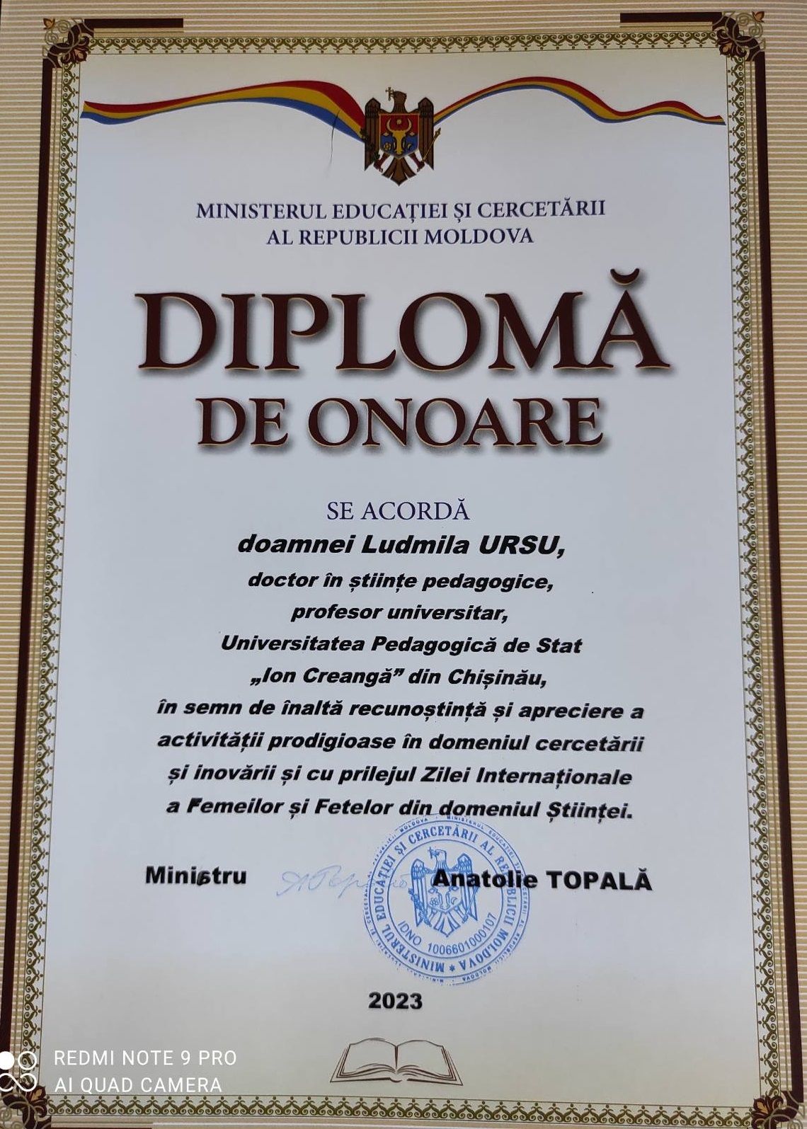 Pentru performanțe notorii în domeniul științei și rezultate remarcabile în activitatea de cercetare, dar și cu ocazia Zilei internaționale a femeilor și fetelor din domeniul științei, marcată anual în data de 11 februarie, Ministerul Educației și Cercetării al R. Moldova a acordat Diplome de Onoare dnei dr., profesor universitar Ludmila URSU, Facultatea de Științe ale Educației și dnei dr., conferențiar universitar Sofia GRIGORCEA, Facultatea de Biologie și Chimie, Universitatea Pedagogică de Stat „Ion Creangă” din Chișinău.