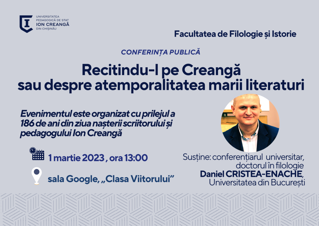 Evenimentul va avea loc în data de 1 martie 2023, ora 13:00, în sala Google, Clasa Viitorului, UPSC, organizat cu prilejul a 186 de ani din ziua nașterii scriitorului și pedagogului Ion Creangă, se adresesză studenților, masteranzilor, doctoranzilor, cadrelor științifico-didactice și tuturor celor interesați.