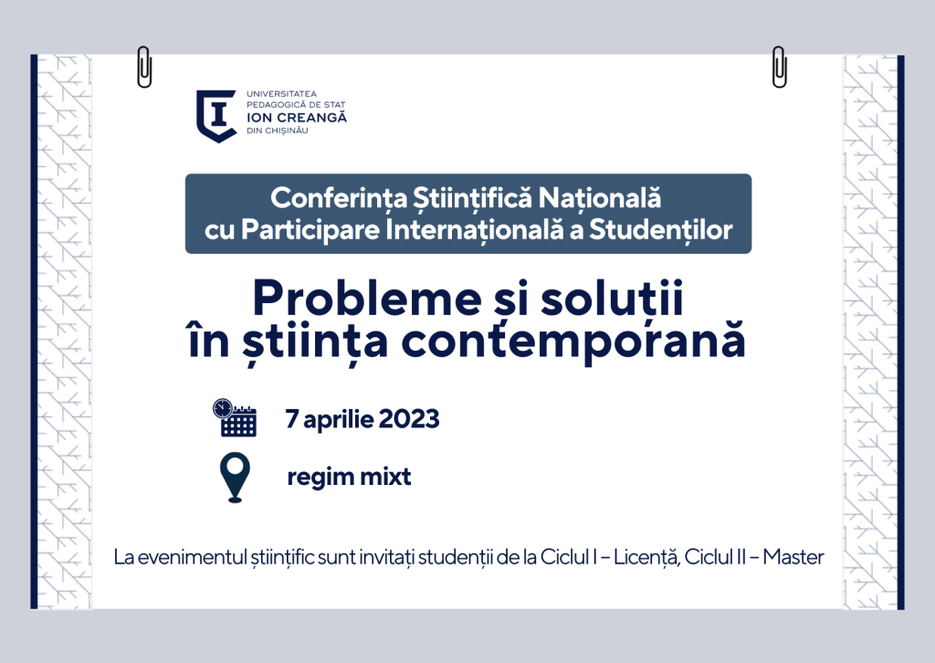 Universitatea Pedagogică de Stat „Ion Creangă” din Chișinău organizează Conferința Științifică Națională cu Participare Internațională a Studenților „Probleme și soluții în știința contemporană”, care va avea loc pe 7 aprilie 2023, în regim mixt.