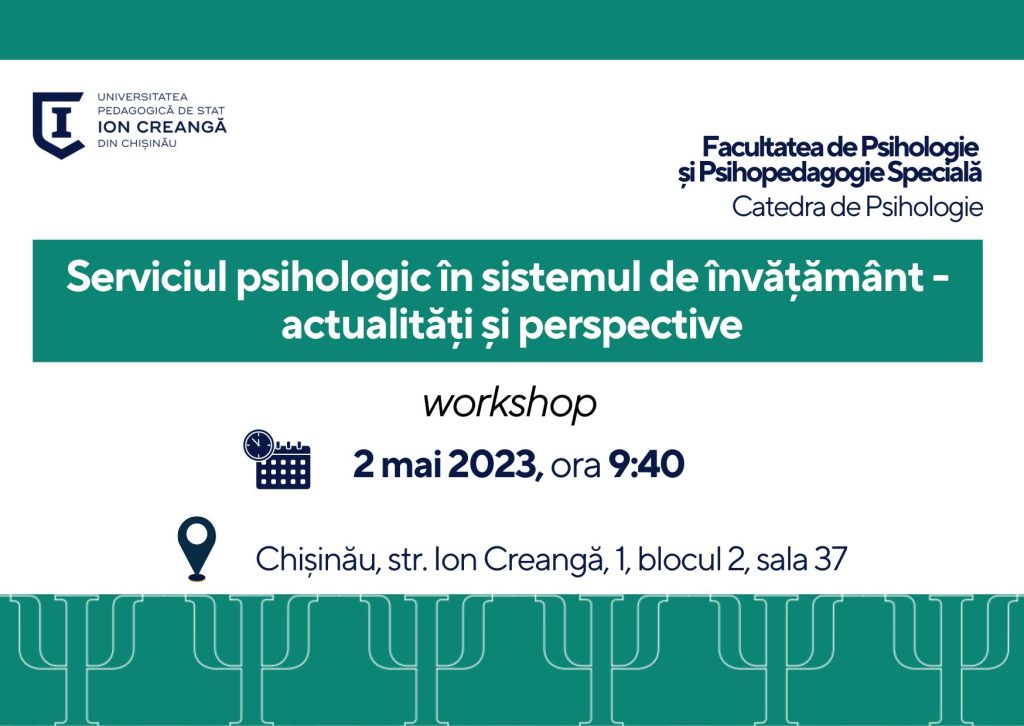 Facultatea de Psihologie și Psihopedagogie Specială, Catedra de Psihologie, organizează, în data de 2 mai 2023 ora 9:40, workshopul „Serviciul psihologic în sistemul de învățământ – actualități și perspective”.