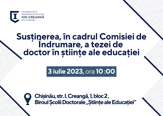 Candidat: BIVOL Teodor Conducător științific: COJOCARU Vasile, dr. hab., prof. univ. Tema tezei: Managementul comunicării eficiente în instituţia şcolară Specialitatea științifică: 531.01 Teoria generală a educației Data: 03.07.2023 Ora: 10:00 Locul: str. Ion Creangă 1, blocul 2, biroul Școlii doctorale „Științe ale Educației” Componența comisiei de îndrumare: