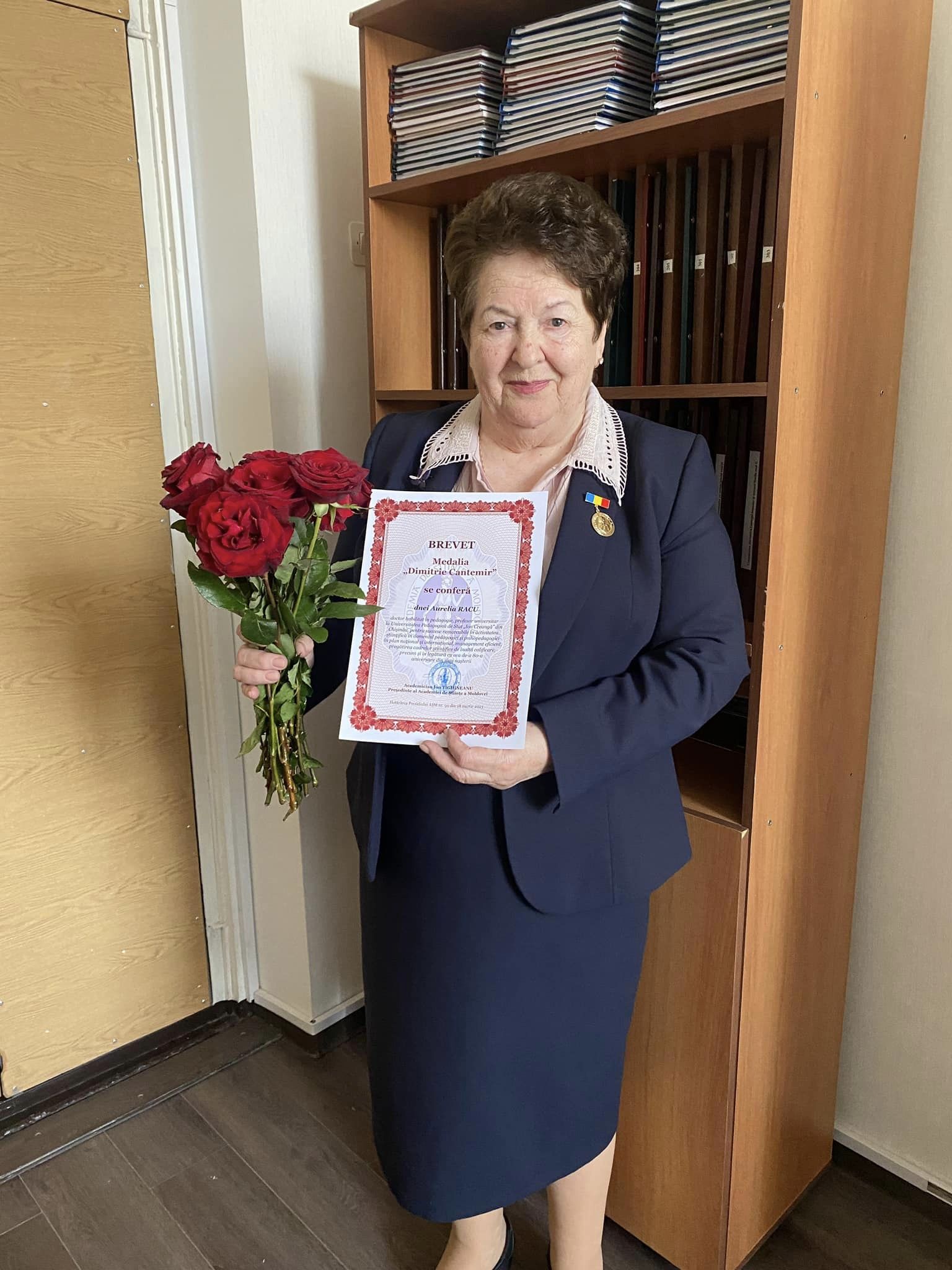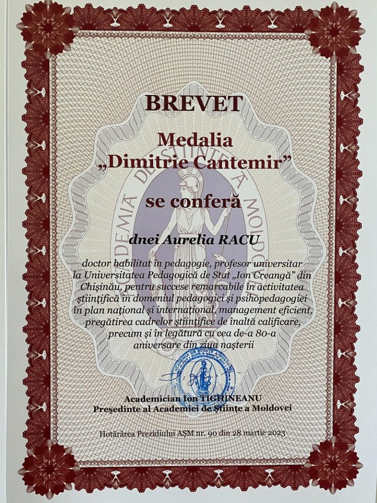 Doamnei Aurelia RACU, doctor habilitat, profesor universitar la Universitatea Pedagogică de Stat „Ion Creangă” din Chișinău i-a fost conferită, recent, medalia „Dimitrie Cantemir”. Înalta distincție, acordată de Academia de Științe a Moldovei, i-a fost decernată dnei Aurelia Racu pentru succese remarcabile în activitatea științifică în domeniul pedagogiei și psihopedagogiei în plan național și internațional, management eficient, pregătirea cadrelor științifice de înaltă calificare, precum și în legătură cu cea de-a 80-a aniversare din ziua nașterii!