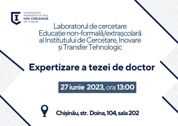 Se organizează ședința de expertizare a tezei de doctor, în cadrul Laboratorului de cercetare Educație non-formală/extrașcolară al Institutului de Cercetare, Inovare și Transfer Tehnologic, UPSC Candidat: COTOVIȚCAIA Daniela Conducător științific: POGOLȘA Lilia, dr. hab., conf. univ. Tema tezei: REPERE TEORETICE ȘI METODOLOGICE DE PROIECTARE ȘI INSTITUȚIONALIZARE A CURRICULUMULUI PENTRU ÎNVĂȚĂMÂNTUL NON-FORMAL, PROFILUL MUZICĂ Specialitatea […]