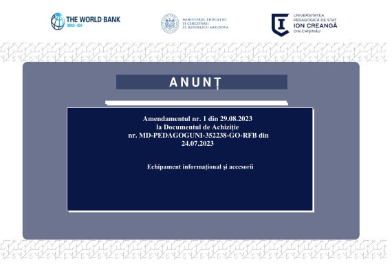 Amendamentul nr. 1 din 29.08.2023 la Documentul de Achiziție nr. MD-PEDAGOGUNI-352238-GO-RFB din 24.07.2023 Echipament informațional şi accesorii Nr. CDO: MD-PEDAGOGUNI-352238-GO-RFB Subproiectul: Asigurarea calității și relevanței formării profesionale a viitorilor pedagogi prin programe de studii inovative și conexe la piața muncii, (ACRVP). Proiectul: Învățământul Superior din Moldova Autoritatea contractantă: Instituția Publică […]