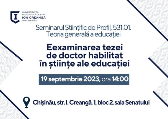 Seminarul Științific de Profil, 531.01. Teoria generală a educației, din cadrul Universității Pedagogice de Stat „Ion Creangă” din Chișinău anunță examinarea tezei de doctor habilitat în științe ale educației, cu tema Reconstrucția pedagogică a eticii în instituția educației, elaborată de PANIȘ Aliona, dr., conf. univ., conducător științific CALLO Tatiana, doctor habilitat în pedagogie, profesor universitar. Ședința S.Ş.P. […]