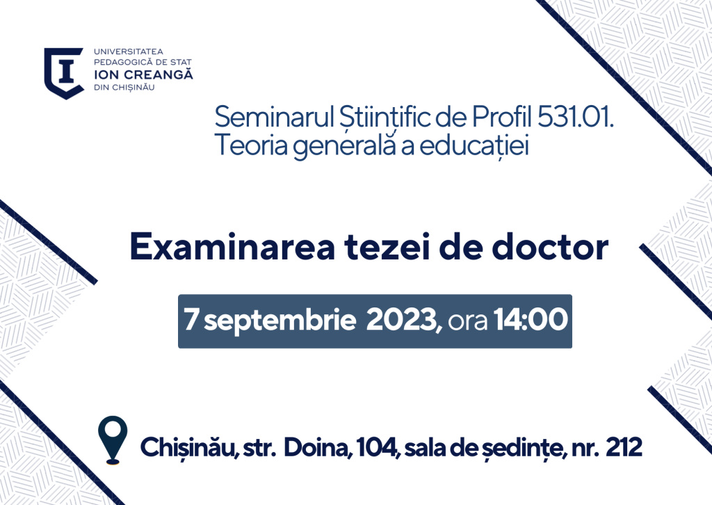 Seminarul Științific de Profil 531.01. Teoria generală a educației din cadrul Universității Pedagogice de Stat „Ion Creangă”, anunță examinarea tezei de doctor în științe ale educației „Mediul școlar ca factor al educației sociale în învățământul primar”, specialitatea 531.01 Teoria generală a educației, autor MOGÎLDEA Iuliana, conducător științific PETROVSCHI Nina, doctor habilitat în științe pedagogice, conferențiar universitar.