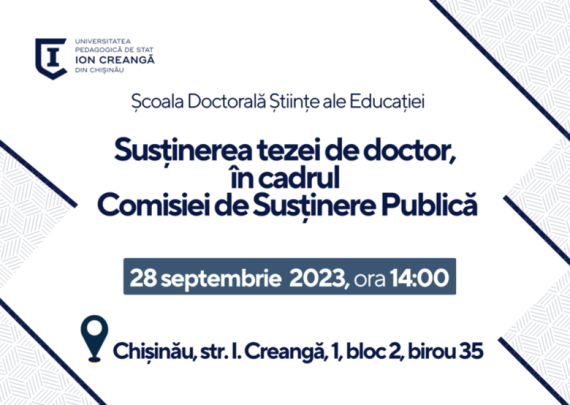 Candidat: POSTOLACHI Iulia Conducător științific: GAGIM Ion, doctor habilitat în pedagogie, profesor universitar Tema tezei: METODOLOGIA FORMĂRII EXCELENȚEI ARTISTICE A CADRELOR DIDACTICE DIN ÎNVĂȚĂMÂNTUL PRIMAR Specialitatea: 531.01 – Teoria generală a educației Data: 28.09.2023 Ora: 14:00 Locul: Universitatea Pedagogică de Stat „Ion Creangă”, blocul de studii nr. 2, Biroul nr. […]