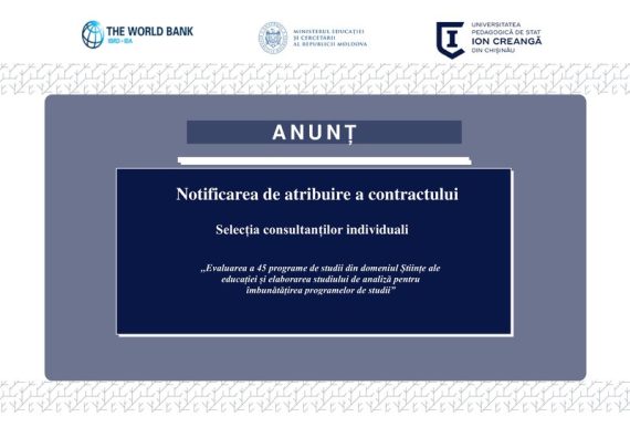 Notificarea privind atribuirea contractului Selecția consultanților individuali Contract nr. 2 ,,Evaluarea a 45 programe de studii din domeniul Științe ale educației și elaborarea studiului de analiză pentru îmbunătățirea programelor de studii” Denumirea proiectului Proiectul Învățământul Superior din Moldova Numărului creditului 6542-MD Denumirea subproiectului „Asigurarea calității și relevanței formării profesionale a […]