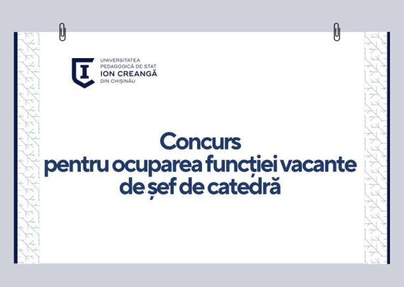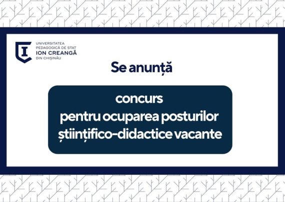 Universitatea Pedagogică de Stat „Ion Creangă” din Chișinău anunță concurs pentru ocuparea posturilor științifico-didactice vacante: Conferențiar universitar – 1 Catedra de Limbă și Literatură Română Conferențiar universitar – 2 Lector universitar – 1 Asistent universitar – 2 Conferențiar universitar – 1Asistent universitar – 1Asistent universitar – 2 Catedra de Filologie Engleză […]